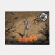Skeleton dancing in a pumpkin garden. Webbed moon with bats, spider and a raven sitting atop a pumpkin.
