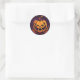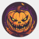Round sticker is shown with a Halloween scary pumpkin print.