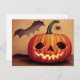 Halloween pumpkin with bat and spider. postcard