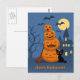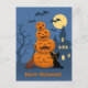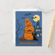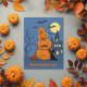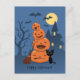 Cute black cat and a witch broom near a stack of laughing pumpkins that are falling over. A dead tree, a creepy mansion, some bats, and the moon are seen on the background.