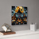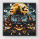 A trio of glowing jack-o'-lanterns with whimsical designs sits beneath a large, eerie moon, as a witch flies over a haunted castle in the background.