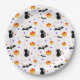 Halloween pumpkins, bats and cats on white Paper Plate.