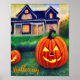 Glowing Halloween Pumpkins Poster, a cozy autumn evening comes to life with candlelit jack-o’lanterns smiling in front of a warmly lit home, capturing the magic and mystery of Halloween night.