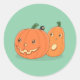A pair of animated pumpkins. One large round pumpkin is smiling toothilly, the other tall pumpkin is spooked by a tiny spider.