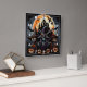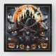 Three whimsical scarecrows with glowing eyes stand amidst carved pumpkins, framed by a haunted castle and bats flying against a vibrant orange moon.