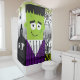 A scary yet cute Halloween shower curtain features Frankenstein in a graveyard with a gnarled tree, black wrought iron fence, tombstone with skull and crossbones that reads RIP, spider web, and spider!