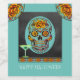 Halloween party wine bottle labels, featuring a sugar skull and decorative flower elements in yellow, turquoise, and orange with decorative type.