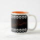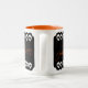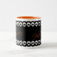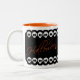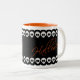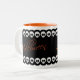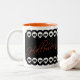 Halloween coffee mug with a printed black "label", lined with skulls, and "Halloween" in an orange script font in the middle.