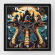 Three snakes adorned with witch hats slither against a backdrop of a haunted castle and a full moon, embodying the Halloween spirit as bats fly overhead.