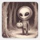 This charming sticker features an illustration of a cute little space alien holding a glowing jack-o-lantern in a dark, eerie wooded area, perfectly capturing the whimsical essence of Halloween with a touch of extraterrestrial intrigue. The adorable alien, with its wide eyes and playful stance, contrasts beautifully against the ominous, shadowy trees of the forest, creating a striking yet fun scene. The jack-o-lantern, illuminated in a warm orange glow, adds a traditional Halloween vibe to the design, while the alien, with its otherworldly appearance, brings in the mysterious elements of UFOs, extraterrestrial life, and the unknown.
