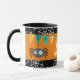 This Halloween mug features a happy spider suspended from his web against a bright orange background. The image is on two sides of the mug, with your custom text between them. You may personalise the mug, or change it to anything you'd like. A colourful banner that says "Trick or Treat" is carried by two black bats. A black and white spider web border adds spooky interest. Cute for any age during the Halloween season, but especially for kids! *Clip art used in this design is copyrighted by Encore Software, Inc., which permits use to its licensors. All rights reserved.
