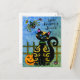 This fun Halloween card features a scene with a cute spider dressed as a witch sitting on her web. A black kitty, with fur decorated in orange swirls, is sitting below her, next to an orange carved pumpkin. Text reads Happy Halloween with a sample name for you to personalise with the name of the recipient.