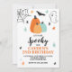 Halloween birthday party invitation. Let's get spooky! birthday bash invite with turquoise pumpkins and stars and spiders.