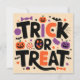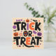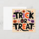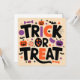 This Halloween design captures the festive and whimsical spirit of the season with a vibrant color palette and playful theme. The words "TRICK OR TREAT" are prominently displayed in the center, with bold black letters topped with orange accents, giving the impression of dancing typography. Surrounding the text is an eclectic collection of iconic Halloween icons, including bright orange smiling pumpkins with black cutouts for eyes and mouth, black bats with outstretched wings, purple and orange candies shaped like candy or coins, a white spider web in the upper right corner with a small spider hanging from it, and several small floating purple ghosts. The overall effect evokes a joyful and childlike atmosphere characteristic of the October 31 celebration.