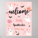 Halloween spooky one cute ghost pink 1st birthday welcome poster. Modern Halloween-themed design for a spooky party! This birthday welcome board features spider's webs, ghosts, pumpkins, bats, spiders, leaves, corns, stars and daisies. This welcome board is great for little girl's birthday parties!
