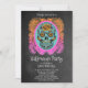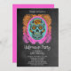 A bold in your face edgy Halloween party invitation with painted sugar skull in orange, turquoise and hot pink, on a chalkboard background with a quirky font. nThe back of the card is hot pink. Sure to catch their attention!