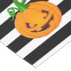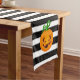 Table runner to accent your table decor is shown in a Black and White stripes print design with a Halloween print.