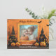 Flanking the photo are towering haunted houses, eerie jack-o’-lanterns, and sneaky bats that set the perfect Halloween tone. The torn-paper effect along the edges gives just the right amount of spooky charm, as if the card itself is part of a mysterious spellbinding parchment. The words Happy Halloween elegantly float above the scene, ensuring the recipient gets into the spirit before they even reach the candy stash.
