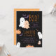 Halloween themed birthday invitation in black, orange and purple. Featuring cute ghosts, bats, pumpkin and fun style typography. Personalised with name, age and party details.