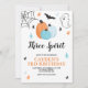 Halloween birthday party invitation. Three Spirit! 3rd birthday invite with turquoise pumpkins and stars and spiders.