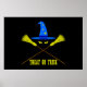 Drawing of a blue wizard's hat, decorated with yellow stars and two crossed witch's brooms under the hat. Demonic yellow eyes between the hat and brooms and a text Treat or trick. Funny Halloween theme. Eat, drink and be scary. Wallart, print, poster, canvas to decorate your room or office