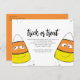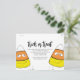 A trendy stylish Halloween budget-friendly postcard. Trick or Treat with these cute, funny, and whimsical Halloween candy corn. These adorable little candy corns are happy and ready to add fun to your Halloween festivities. Whimsical orange, yellow and black candy with drawn smiling eyes and smiling faces are cute and can be customised to your liking. With QR code and Facebook social media icon so your guests can easily access your Facebook events page, This design features Halloween party whimsical cute October, trick or treats candy corn, simple minimalist typography, orange black yellow, October Halloween simple, kids adults family costume Halloween, Halloween birthday party invitation, cute fun funny silly face, Halloween party invites, laura lacina