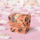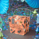 Pack this takeout box with candy. Halloween pattern of ghosts, bats, tombstones, spiders and other Halloween icons. Text says Trick or Treat.