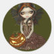 A moody Halloween painting - I've painted this winged beauty at twilight - there is a smoky dusk in the air as the unseen sun is setting. The bare trees give a taste of chill in the air. There's a big lovely Jack O'lantern too, grinning mischievously in the lap of her elaborate striped gown.. My own original acrylic painting.