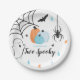 Halloween birthday party plates. Two Spooky! birthday bash invite with turquoise pumpkins and stars and spiders.
