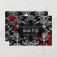 Personalised Gothic style wedding RSVP card for your Halloween or vampire theme wedding. It is black with a light to dark grey damask pattern on it and blood splatters that you can remove if desired. Add your own text on the front and the back.