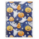 This design features a whimsical and festive Halloween-themed watercolor pattern. The design includes a dark, starry night sky as the background, which sets the stage for a collection of friendly ghosts and cheerful jack-o'-lanterns. The ghosts are painted in soft whites with various cute expressions, floating playfully around the scene. The pumpkins are bright orange, with carved faces ranging from happy to mischievous. Small white skulls are scattered throughout, adding to the Halloween ambiance. The overall pattern is fun and lighthearted, perfect for celebrating the spooky season in a cute and charming way.