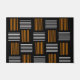 This doormat has a mid-century modern design that looks like a weave with orange and white lines on a field of black.