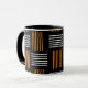 This mug has a mid-century modern design that looks like a weave with orange and white lines on a field of black.