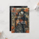 Halloween Wedding with a cute skeleton couple dressed in their finest clothes. Bride wears a black dress with images of skulls on it and has pumpkins in her hair. Groom wears a black suit and pointed top hat. There are big black spiders crawling around while a Bat hangs from the mantle. Goth wedding invitation that can be customised to suit your needs.