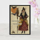Halloween card with witch holding broom, owl, bats, full moon, and skull and cross bones, and old text in background