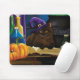 A magical chocolate coloured cat wearing a purple with a witch hat sitting on books. Cauldron, pumpkins, potions, books, and a wand sit amongst the cat