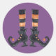 Fun Halloween design features witches feet decked out in black and orange striped stockings with pointed toe boots, on purple background