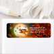 A Halloween return address label with a witch flying past a full moon with fall leaves.