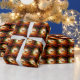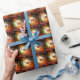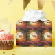 Wrapping paper with my original design of witches on brooms flying past spooky full moons on Halloween night, stirring up the autumn leaves.