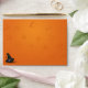 Happy Halloween illustration featuring a witch hat with golden stars and moon and a hanging spider on an orange background with jack-o-lantern pattern shapes.