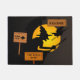 A graphic design of Halloween witches with the text 'Welcome- the witch is in" on a funny door mat.