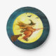 Witch on a broomstick against the moon, with flying crows. Halloween party paper plates for your party.