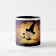 Cute little witch flying off on her broomstick with her cat to a Halloween party.