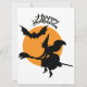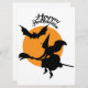 Halloween witch on broomstick with bat, witch card