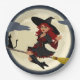 A happy red headed witch rides on her broomstick with her famliar cat on a moonlit night