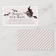 This Halloween baby shower please bring a book/books for baby/book request features a witch on a broomstick and a pair of bats on a light pink background. The reverse side features a white background with diagonal stripes in pink. Personalise it for your needs. You can find matching products at my store.
