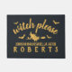 Classic and elegant Halloween doormat for fall with dark faux burlap background in spooky dark grey - "witch please" text in butternut orange with bats, a flying witch, and your family name