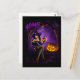 Happy Halloween card. The sexy witch sits on the window in a black dress with pumpkins for Halloween. This postcard conveys the mystical atmosphere of Halloween.