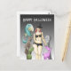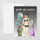 The pretty witch stands with her funny and creepy friends on a Halloween postcard.