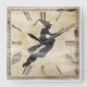 A graphic design to look like a square vintage clock face with a Halloween season theme. A black silhouette of a witch flying on a broom is in front of the weathered, rusted clock face.